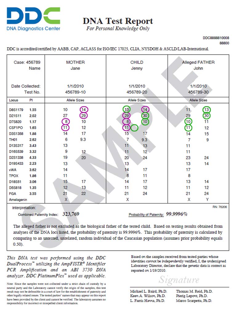 การตรวจ DNA พิสูจน์ความเป็นบิดาทำอย่างไรเราจะเก็บตัวอย่าง DNA โดยการป้ายเนื้อเยื่อด้านในกระพุ้งแก้มของผู้เข้ารับการตรวจด้วยก้านไม้พันสำลี การตรวจจะไม่มีเลือดและไม่รู้สึกเจ็บ (เรียกว่า "buccal cells" และ "buccal swabs") ตัวอย่าง DNA จะถูกนำไปตรวจพิสูจน์ที่ห้องปฏิบัติการเพื่อเปรียบเทียบ DNA ของผู้เข้ารับการตรวจ ไม่มีใครที่จะมี DNA เหมือนกันทุกจุด (เว้นแต่แฝดเหมือนเท่านั้น) DNA ของคนเราครึ่งหนึ่งมาจากบิดา และอีกครึ่งหนึ่งมาจากมารดา ในการตรวจ DNA พิสูจน์ความเป็นบิดานั้น เราจะเทียบผล DNA ของบุตรและบิดา เราสามารถบอกได้ว่าเป็นพ่อลูกกันหรือไม่ด้วยความแม่นยำถึง 99.99+ เปอร์เซ็นต์ DNA ระหว่างบุคคลสองคนนั้นจะมีเปอร์เซ็นต์ความเหมือนกัน 99.9% (และมนุษย์มี DNA เหมือนกับสัตว์เลี้ยงลูกด้วยนมชนิดอื่น ๆ เช่น ลิง ประมาณ 95%) ฉะนั้นเราต้องรู้อีก 0.1% เพื่อเปรียบเทียบ DNA และใน 0.1% นี้จะแตกต่างกันไปขึ้นอยู่กับแต่ละบุคคล อาทิเช่น สีผม สีตา สีผิว และอื่น ๆ อีกมากมาย ใน 0.1% นี้บางส่วนของ DNA จะมีความแตกต่างกันเล็กน้อยขึ้นอยู่กับแต่ละบุคคล และส่วนอื่น ๆ จะมีความแตกต่างกันมาก เราต้องระมัดระวังว่าเราเปรียบเทียบส่วนไหนของ DNA ห้องปฏิบัติการของเรานับว่าเป็นห้องปฏิบัติการที่เก่าแก่ที่สุดและใหญ่ที่สุดในโลก เราได้สร้างฐานข้อมูลความแปรผันของ DNA ของมนุษย์และสถิติประชากรมนุษย์ขึ้นมาเองเป็นเวลาหลายสิบปีแล้ว ฐานข้อมูลเหล่านี้นำไปใช้ในการคำนวณเปอร์เซ็นต์ความน่าจะเป็นบิดา บางคนอาจจะบอกว่าผลการพิสูจน์ของตนเองมีความแม่นยำถึง 99.9999999% แต่ว่าจะเป็นจริงหรือเปล่า? เราสามารถแสดงรายละเอียดการคำนวณของเราให้คุณดู โดยปกติผลการตรวจพิสูจน์จะมีค่าเท่ากับ 99.99+ หรือ 0 เปอร์เซ็นต์ ซึ่งจะระบุได้ชัดเจนว่าเป็นบิดาหรือไม่ ในการตรวจ DNA ของแต่ละบุคคล เราตรวจให้อย่างน้อยที่สุด 20 ตำแหน่งมาตรฐาน ("loci" เป็นพหูพจน์ของ "locus") โดยเราจะวัดความยาวของ "allele" ของ DNA ในแต่ละ locus (ก่อนหน้านี้ห้องปฏิบัติการของเราตรวจให้อย่างน้อย 16 loci แต่ภายหลังจากที่เราได้ปรับปรุงเครื่องมือให้มีความทันสมัยมากยิ่งขึ้นเราได้เพิ่มให้เป็นอย่างน้อย 20 loci ในราคาเดิม แต่จะมีบางข้อความหรือบางกราฟิกบนเวปไซต์นี้ที่เขียนไว้ตั้งแต่ครั้งที่เราตรวจให้เพียง 16 loci) เมื่อเราอ่านรายงานผลจากห้องปฏิบัติการจะเห็นว่าแต่ละคนจะมีตัวเลข 2 แถว แต่ละแถวจะมีค่าตัวเลขเท่ากับขนาดของ allele ของ DNA ในตำแหน่งของ "locus" นั้น ๆ ของเด็กจะมี 2 alleles ของผู้ที่ถูกกล่าวอ้างว่าเป็นบิดา 2 alleles และอาจจะมีของมารดาอีก 2 alleles ในตารางจะแสดงรายการ locus 16 แถว และในแต่ละ locus เราจะดู alleles ของเด็ก 2 ค่าก่อน ในก
